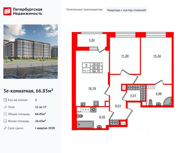 Окна южной стороны позволят не пропустить редкие мгновения Питерского солнца, а высота потолков 2.8 м говорит о том, что в квартире всегда будет достаточно воздуха.