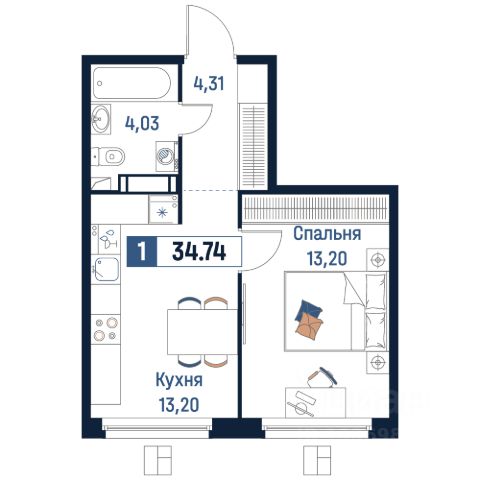 - ОДНА комната (15.2 м²) правильной формы с балконом, на котором в теплое время будет приятно провести время.