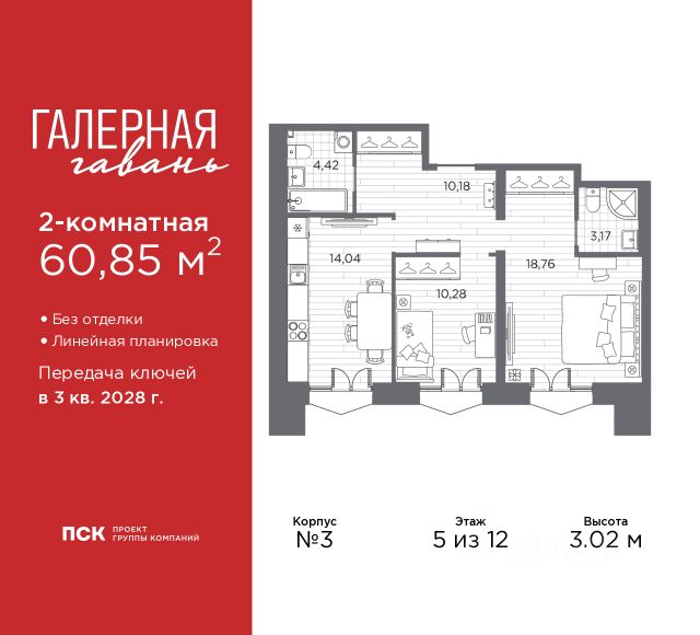 2-комн. квартира от застройщика в ЖК "Галерная гавань" на 4 этаже. Квартира без отделки, после оформления собственности можно делать ремонт. Общая площадь: 60.35 кв.м., жилая: 30.26 кв.м., площадь просторной кухни-столовой: 12.47 кв.м. Комнаты изолированные, все окна выходят на одну сторону. В квартире два совмещенных санузла. Высота потолков 3.02 м. Дом монолитный, трехподъездный, высотой 12 этажей. Квартира находится в 6-й секции в корпусе 3. На этаже 7 квартир. В подъезде 1 пассажирский и 1 грузовой лифт. Начало строительства - 4 квартал 2025 года. Окончание строительства - 3 квартал 2028 года. Оформление сделки по договору долевого участия. В шаговой доступности от жилого комплекса расположена станция метро (расстояние по прямой) "Приморская" (1.6 км), также недалеко от этого корпуса находятся станции метро: "Горный институт", "Василеостровская", "Спортивная", "Крестовский остров". "Галерная гавань" — это жилой комплекс бизнес-класса в исторической части Васильевского острова — на берегу Галерной гавани, ведущей свою историю с 1724 года. В свою очередь, исторический Васильевский остров это университеты, школы, детские сады, поликлиники, несколько станций метро и прочая инфраструктура без проблем с транспортной доступностью. В "Галерной гавани" шесть корпусов на 813 квартир, площадью от 29,5 до 134 кв.м. Высота потолков 3 м. Два корпуса из шести всего на 20 квартир. На верхних этажах расположатся квартиры с большими террасами и панорамным остеклением. Также есть квартиры с французскими балконами и мастер-спальнями. Четыре квартиры из каждых пяти с видами из окон на тихую воду, на старые и новые городские символы. Паркинг займет весь подземный объем квартала, и будет вмещать 606 автомобилей. Фасады "Галерной гавани" выполняются в стиле баварской кирпичной кладки, с акцентами из керамогранита графитового оттенка. Объемы задаются ризалитами с художественной подсветкой. Для жителей будет создан комьюнити-клуб с переговорной и библиотекой, кинозалом, кофе-поинтом, детской комнатой с пространством для мастер-классов, фитнес-зоной, а также бьюти-кабинетом. "Галерная гавань" — это также первый в Петербурге жилой комплекс с общественным пространством у воды. ГК "ПСК" восстановит десять исторических зданий, в которых расположатся рестораны, кафе, фитнес-клуб с бассейном, культурное пространство, театр и офисы. При этом набережная будет превращена в пешеходную, в территорию общественного пространства. #zMba7c