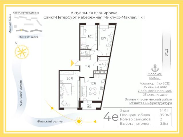 Продается 3-комнатная квартира в ЖК "Морская набережная" на 17 этаже. Общая площадь составляет 74.50 кв. м. Квартира с white box отделкой. Жилой комплекс "Морская набережная" располагается по адресу Санкт-Петербург, Василеостровский. Жилой комплекс "Морская набережная" - проект бизнес-класса на Васильевском острове, расположенный на берегу Финского залива. Этот район гордится большим количеством культурно-исторических объектов, активно участвует в развитии современной культуры. Расположение: • 3 минуты до ЗСД; • 10 минут на автомобиле до станции метро "Приморская"; • 18 минут на автомобиле до стрелки В.О. и исторического центра города. "Морская набережная" - это экологически благополучное место с чистым грунтом и свежим воздухом. Прямо перед домом - благоустроенный сосновый парк. Хвойный массив поднимется вместе со строящимися домами - здесь уже высажено более 1 300 деревьев двухметровой высоты. Выйдя из дома, можно отправиться на прогулку в парк или пройти через двор к набережной у залива. Проект набережной выполняется в духе европейского ландшафтного дизайна: высаживаются лиственные деревья и сосны, поднимается уровень дерна, газоны украшаются злаками и кустарником. Преимущества: • Высокие потолки и широкие окна; • Подземный паркинг с лифтом до Вашего этажа; • Огороженный внутренний двор без машин; • Система "Умный дом" и видеонаблюдение; • Школа и детские сады на внутренней территории ЖК; • Инфраструктура шаговой доступности на первых этажах корпусов; • Продуманная территория для отдыха, игр и спорта. Успейте приобрести квартиру на выгодных условиях! Чтобы узнать подробности, обращайтесь за консультацией по телефону.