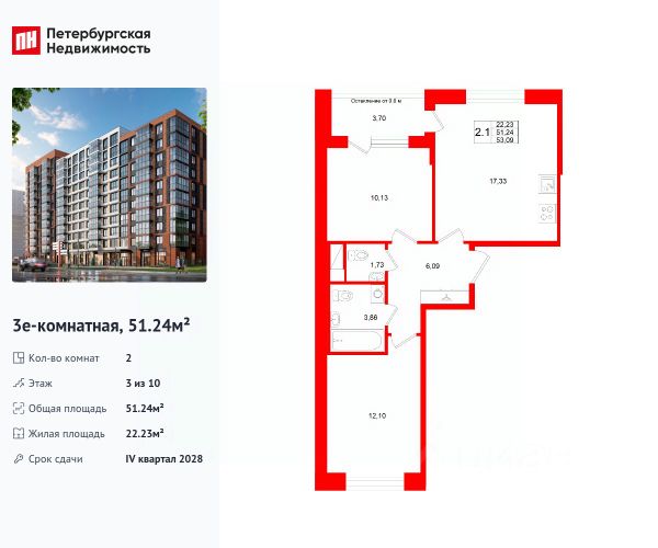 Продается уютная 2-комнатная квартира от застройщика в жилом комплексе "Титул в Московском" в престижном Московском районе. До метро можно добраться пешком всего за 25 минут. Удобная, классическая, функциональная европланировка, большая кухня-гостиная 16.73 м², вместительная прихожая 6.09 м². Общая площадь квартиры - 51.24 м², жилая 22.23 м², высота потолка 2.77 м. Квартира продается с отделкой "Норд Лайн светлый плюс". Что особенного в ЖК "Титул в Московском"? • Престижный Московский район • Авторская архитектурная концепция • 2 центральные входные группы с ресепшн и лаундж-зонами • Кленовая аллея с арт-стеллой, цветочная аллея и сад трав • Уютные дворы-патио, площадки SetlKids и SetlSport • Инновационный Лицей Setl с оригинальной архитектурной концепцией и уникальной образовательной средой