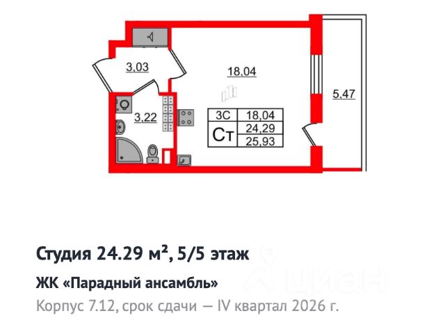 Светлая студия в новом ЖК Аэросити-5 — идеальное сочетание комфорта и удобства. Предлагаю светлую уютную студию 18,8 м² в новом современном жилом комплексе Аэросити-5. Площадь с балконом - 23,2 м2. Ключевые преимущества: - Большие окна и высота потолков 2,7 м создают ощущение пространства и дневного света. - Просторный балкон 4,4 м² с панорамным остеклением — идеальное место для утреннего кофе или вечерних посиделок. - Окна выходят на запад — панорамный вид на закат; перед окнами нет домов, что обеспечивает максимальную свободу обзора. - Без отделки: возможность реализовать собственный дизайн-проект с нуля. - На этаже всего 7 квартир, что обеспечивает спокойствие и приватность. - Отличная транспортная доступность: 5 минут пешком до остановки нового трамвая Славянка, который связывает Шушары и метро Купчино. - Развитая социальная и коммерческая инфраструктура рядом: новая современная школа и детский сад, магазины и кафе буквально в шаговой доступности. Как использовать квадратные метры: - Бытовая зона с кухней может легко быть объединена в единое помещение, оставаясь функциональной и стильной. - Балкон можно превратить в уютный уголок отдыха: мини-огород, лаундж-зона или рабочее место на свежем воздухе. - Идеально подходит для молодых специалистов, пары или тех, кто ищет светлое, уютное пространство под собственный дизайн. Готовы увидеть квартиру воочию? Звоните/пишете, договоримся о просмотре в удобное время. Цена обсуждается при просмотре. Один взрослый собственник. Никто не прописан. Квартира в ипотеке Сбербанка.