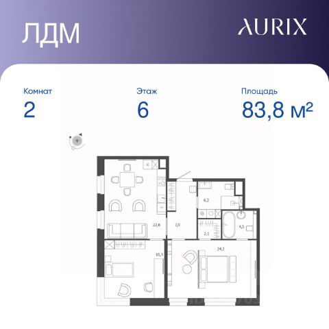 Продается 2-к квартира без отделки в ЖК "ЛДМ". Общая площадь квартиры — 83.8 кв. м, этаж 6 из 9. Тип дома — монолитный. Цена указана при 100% оплате. Описание из материнского фида