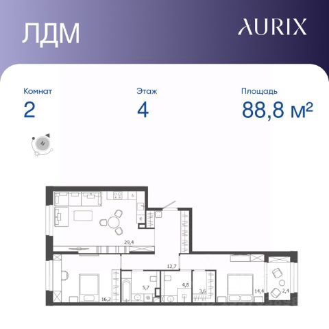 Продается 2-к квартира без отделки в ЖК "ЛДМ". Общая площадь квартиры — 88.8 кв. м, этаж 4 из 9. Тип дома — монолитный. Цена указана при 100% оплате. Описание из материнского фида