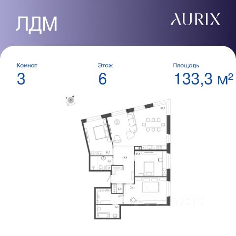 Продается 3-к квартира без отделки в ЖК "ЛДМ". Общая площадь квартиры — 133.3 кв. м, этаж 6 из 8. Тип дома — монолитный. Цена указана при 100% оплате. Описание из материнского фида