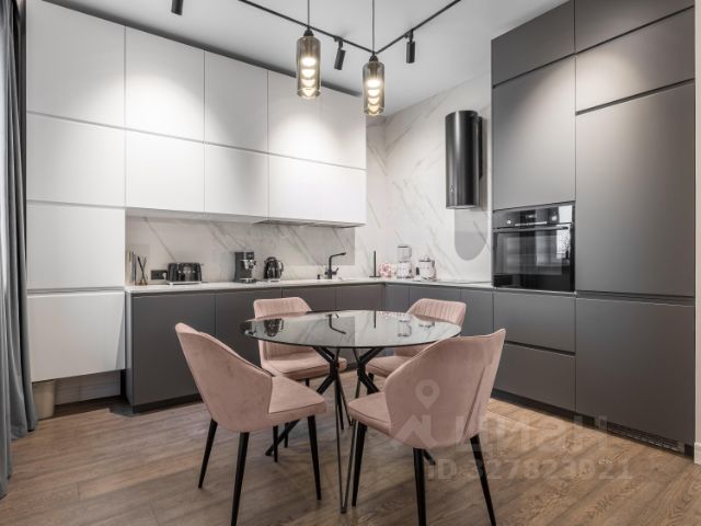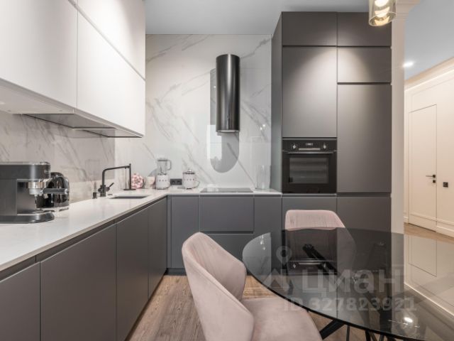 Большая кухня. Мебель в современном стиле, фасады из массива дуба под покраску. Встроенная техника: индукционная плита, духовой шкаф, СВЧ, ПММ, 2 холодильника от Bosch. Столешница и фартук из чешского кварцевого агломерата Technistone. Фильтры воды, смеситель Omoikiri. Великолепные стулья от Deephouse вокруг большого функционального острова.