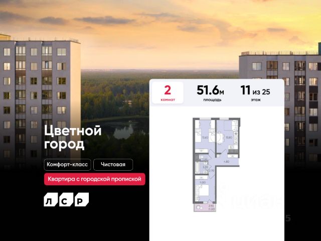 Цена действует при 100% оплате и на определенные ипотечные программы. Подробности — в отделе продаж по телефону. Продается 1-комнатная квартира в ЖК "Цветной город" на 5 этаже. Общая площадь составляет 26.30 кв. м. Квартира с чистовой отделкой Срок сдачи дома: 3 квартал 2026. Жилой комплекс "Цветной город" располагается по адресу Санкт-Петербург, Красногвардейский. "Цветной город" - современный масштабный эко-проект: жилые кварталы со своей сетью улиц, пешеходными бульварами и велодорожками, площадками для спорта и отдыха. Кварталы располагаются вдоль береговой линии реки Охты. "Цветной город" - это жизнь вблизи природы, но с городской пропиской. К 2026 году на берегах реки Охты будет создан Пейзажный парк с летними экотропами и зимними горками для тюбингов, скейт-парком и летним кинотеатром. В ЖК "Цветной город" запланировано и уже частично реализовано строительство 10 школ, 16 детских садов, 4 поликлиники, больница, ТРК, спортивно-оздоровительные сервисы С центром Петербурга жителей "Цветного города" свяжет Пискарёвский проспект, удобный выезд на КАД позволяет без труда добираться до других районов. Расположение: • 10 минут на авто до КАД; • 15 минут на авто до станций "Гражданский проспект" и "Академическая"; • 20 минут до ж/д станции "Ручьи".; Квартира сдается с готовой отделкой из современных экологичных материалов: на стенах плотные белые обои под покраску, на полу износостойкий матовый ламинат, в санузлах керамическая плитка на стенах и керамогранит на полу. Трубы отопления скрыты в стяжке пола и не мешают мебели. В квартире предусмотрено большое количество двойных розеток и выключателей. В ЖК "Цветной город" предусмотрена система "Умный дом": смартфон с приложением является ключом от всех дверей в ЖК, гостевой доступ оформляется в приложении, видеозвонки от домофона поступают в приложение, показания счетчиков автоматически передаются в учетные базы ЖКХ. Преимущества: • Рядом лесопарк и река Охта • Живописные виды из окон • Безбарьерная среда • Развитая социальная инфраструктура • Система "Умный дом" Успейте приобрести квартиру на выгодных условиях! Чтобы узнать подробности, обращайтесь за консультацией по телефону.