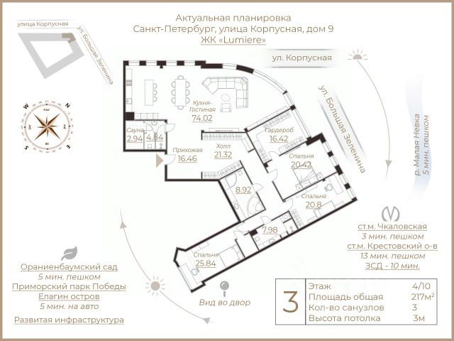 ЖК расположен в центре элитного Петроградского р-на. До метро "Чкаловская" пешком 5 мин. Все есть в шаговой доступности: магазины и ТЦ, школы и гимназии, детские сады (частные и государственные), поликлиники и центры частной медицины, фитнес клубы, театры и музеи. В 10 минутах ходьбы находится Крестовский Остров со всеми его прелестями: парками, аттракционами, ресторанами класса люкс, спортивными аренами, причалом для яхт. Отличная транспортная доступность в любую точку города. Выезд на ЗСД 7 мин.