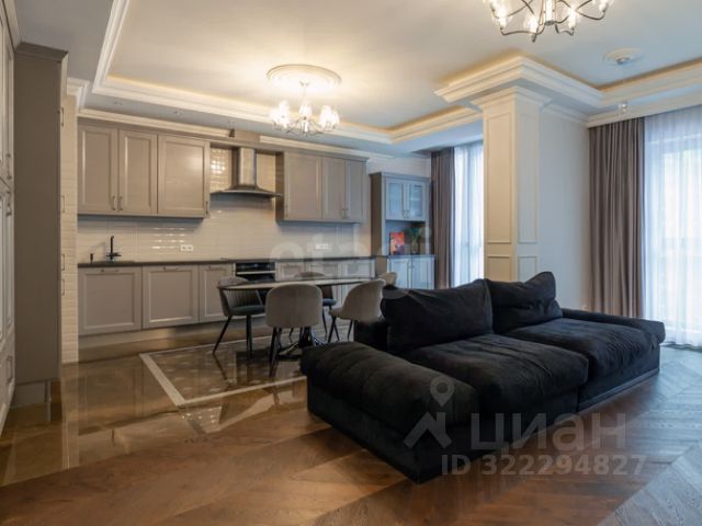 Кухня премиум-класса, совмещена с гостиной. Оборудована встроенной техникой: варочная панель, духовой шкаф, ПММ от Miele, холодильник Smeg. Окна выходят во внутренний двор, есть выход на закрытый балкон с теплым полом. Гостиная обустроена дорогой итальянской мебелью, которая специально подбиралась в Италии. Телевизор Sony с диагональю 75".