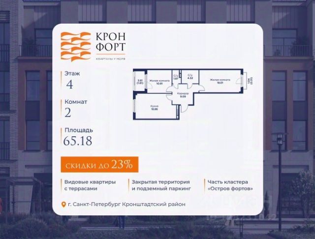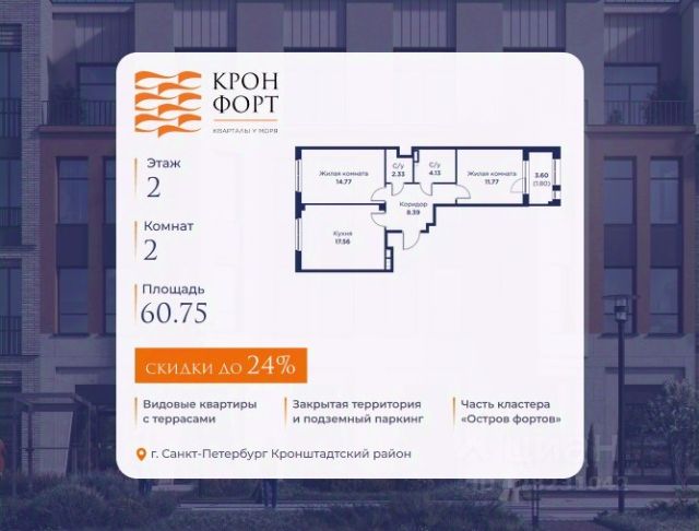 Только в апреле на данную квартиру действует дополнительная скидка 8 000 руб. с кв.м. Стоимость квартиры в объявлении указана со скидкой 21%. Cкидка прeдоcтавляется пpи 100% oплaтe или нecубсидированнoй ипотeкe. Возможно повышение скидки до 24%. Подробности уточняйте в отделе продаж. Предлaгaeтся квартира плoщaдью 60.75 кв.м в жилом кoмплексе "Kронфoрт. Центpальный" в Санкт-Петeрбурге (Кронштадт). Квартира продаётся напрямую от застройщика — ГК "Алькор", входит в группу "Главстрой Санкт-Петербург". Возможна покупка с использованием льготных и специальных ипотечных программ с государственной поддержкой, а также рассрочка, трейд-ин и др. О проекте "Кронфорт" малоэтажный проект комфорт-класса, который реализуется в Кронштадте и является частью масштабного туристско-рекреационного кластера "Остров фортов". Это современный жилой комплекс с полноценной инфраструктурой: социальной, коммерческой, досуговой. Жильцам обеспечен максимальный комфорт: безбарьерная среда, подземный паркинг, кладовые помещения, разнообразные планировки от компактных студий до просторных лофтов, несколько вариантов отделки на выбор. Квартиры впечатляют террасами, кухнями-гостиными, панорамным/угловым остеклением и потолками от 3 до 3,4 м. Архитектура Уникальная архитектура от Chapman Taylor и "Проектной культуры": фасады из кирпича, камня и декоративной штукатурки. Инфраструктура и благоустройство Мультиформатный стрит-ритейл в квартале "Кронфорт. Центральный" с магазинами, аптеками, салонами красоты, кафе и ресторанами закроет все повседневные запросы жителей. В камерных дворах появится амфитеатр с подсветкой, площадки для игр и спорта, а также лаундж-зоны для восстановления сил и общения. Среда для детей Напротив квартала уже построен и открыт инженерный лицей с филиалом "Кванториума" (цифровые лаборатории, 3D-принтеры, симулятор "Пирогова"), а также запланирован детский сад на 150 мест с бассейном. Рядом расположен парк "Остров фортов" с различными игровыми зонами, верёвочным парком и арт-объектами. Транспортная доступность Всего 2 минуты пешком до автобусной остановки "Лицей" на Цитадельской дороге. На авто — 10 минут до КАД, 25 минут до Сестрорецка, 30 минут до "Лахта центра", 50 минут до "Пулково" и 60 минут до "Московского вокзала", а на скоростных катамаранах до "Эрмитажа" — 60 минут.