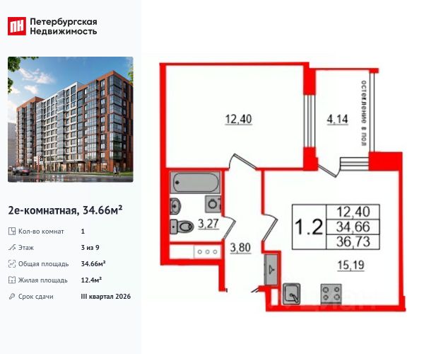 Продается просторная 1-комнатная квартира от застройщика в жилом комплексе "Титул в Московском" в престижном Московском районе. До метро можно добраться пешком всего за 25 минут. Удобная, классическая, функциональная европланировка, большая кухня-гостиная 15.19 м², вместительная прихожая 3.8 м². Общая площадь квартиры - 34.66 м², жилая 12.4 м², высота потолка 2.77 м. Квартира продается с отделкой "Норд Лайн светлый плюс". Что особенного в ЖК "Титул в Московском"? • Престижный Московский район • Авторская архитектурная концепция • 2 центральные входные группы с ресепшн и лаундж-зонами • Кленовая аллея с арт-стеллой, цветочная аллея и сад трав • Уютные дворы-патио, площадки SetlKids и SetlSport • Инновационный Лицей Setl с оригинальной архитектурной концепцией и уникальной образовательной средой Продам квартиру на улице Кубинская в Санкт-Петербурге.