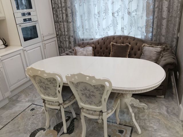 В кухне встроенный кухонный гарнитур итальянская классика белого цвета с серебряной патиной, столешница из натурального камня кварц, диван раскладной, встроенный холодильник Либхер, встроенная посудомоечная машина, микроволновая печь и духовка фирмы Bosch.