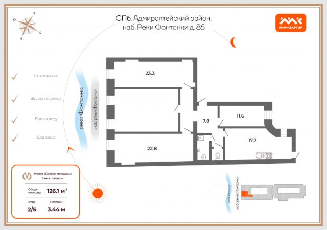 Арт. 126856654 Квартира с видом на Фонтанку в историческом доме XVIII века На Фонтанке, в стенах классического кирпичного дома 1798 года, построенного для княгини З.Н. Юсуповой, предлагается к продаже пятикомнатная квартира площадью 217,7 м². Исторический фасад, тишина закрытого двора, вид на воду — это пространство создано для тех, кто ищет баланс между архитектурным наследием, приватностью и высоким уровнем комфорта. Квартира расположена на высоком этаже. Из пяти окон открывается панорама на реку Фонтанку. Одно из них — с балконом. Остальные шесть окон выходят в тихий двор. Внутреннее пространство квартиры логично спланировано: кухня-столовая 40 м², гостиная 40 м², мастер-спальня 26,9 м², спальня 18,5 м², кабинет 15 м², дополнительная комната площадью почти 33 м² — возможно использование под детскую, библиотеку, мастерскую или отдельную зону для гостей. Пять санузлов, два гардероба, постирочная, прихожая и холл — пространство адаптировано под все бытовые сценарии семьи. Квартира подготовлена по технологии White Box — выполнено более 80% строительных работ. Усилены и частично заменены перекрытия, проведены новые инженерные сети. Установлены приточно-вытяжная вентиляция, автономный газовый котёл, дубовые окна, выключатели Jung, сантехника Duravit. Все материалы и оборудование закупались для собственного проживания — продумано всё вплоть до фурнитуры и плинтусов. Также к квартире прилагается авторский дизайн-проект. Закрытая парадная на шесть квартир. Дом без коммунальных историй, с лифтом OTIS, охраной и консьержем. Во дворе — закреплённые парковочные места для двух автомобилей. Локация — один из ключевых факторов. Фонтанка — река, с которой начинался Петербург, и которая по-прежнему остаётся его культурной осью. В пешей доступности — Юсуповский дворец, Никольский собор, Мариинский театр, Набережная Крюкова канала и Сенная площадь. До метро — семь минут спокойным шагом. Это пространство для тех, кто ищет редкое сочетание: классика без пафоса, готовность к жизни без компромиссов, история, в которую не нужно встраиваться — она уже стала фоном для вашего будущего дома. Продается квартира на набережной Реки Фонтанки в Санкт-Петербурге.