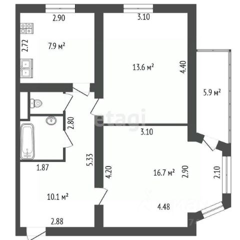 - 4 изолированные комнаты 9,06 м2, 9,68м2, 12,36м2, 12,83 м2.