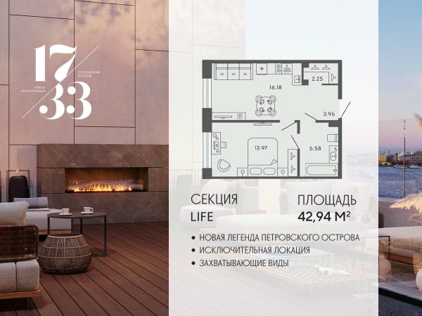Сдаем в 2026 году! Апартамент 1 в Комплексе "17/33 Петровский остров" О проекте: Премиальный комплекс резиденций для истинных ценителей изысканной архитектуры, непревзойденного сервиса и необыкновенной панорамы Санкт-Петербурга. Уникальное расположение между Малой Невой и Петровским прудом подарит будущим резидентам неповторимое ощущение жизни на собственном уединенном острове. Уникальная локация. Проект расположен в объятьях главных островов Петербурга — Петроградской стороны, Васильевского и Крестовского, и в самой зеленой и выигрышной части Петровского — на первой линии Малой Невы, между величественной рекой и тихим Петровским прудом. До ключевых точек притяжения, любимых парков, шопинга и развлечений — пара минут на авто. 100% видовых апартаментов. Виды на Малую Невку, на Петровский пруд.; Проект разделен на три формата: Club, Life, Residence; 5-8 этажей; высота потолка до 7 метров; 1000 м2 общественных пространств; фитнес и СПА; кинозал и зал для семейных торжеств; коворкинг и детский клуб; лаундж с библиотекой; терраса площадью 120 м2 для резидентов; ELEMENT создаёт инновационные жилые и коммерческие объекты в Санкт-Петербурге и Москве, которые устанавливают новые стандарты эффективной жизни в мегаполисах. Купить квартиру в районе Петроградский в Санкт-Петербурге.