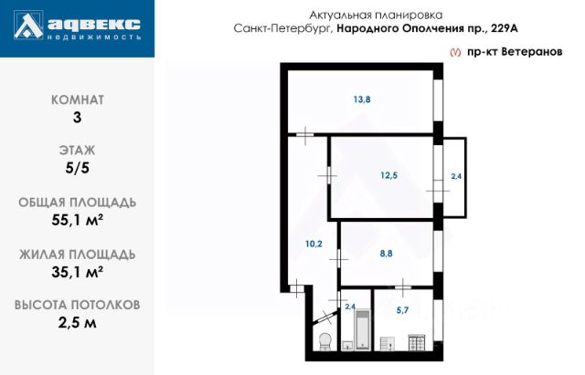 • Две изолированные комнаты — 12,8 м² и 17,0 м²