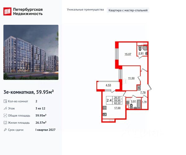 Продается просторная 2-комнатная квартира от застройщика в жилом комплексе "Бионика Заповедная" в динамичном Приморском районе. До метро можно добраться на транспорте всего за 11 минут. Мастер-спальня с собственной ванной комнатой. Самое приватное пространство в вашей квартире. Уникальная, функциональная европланировка, большая кухня-гостиная 17 м², просторная прихожая 7.78 м². Общая площадь квартиры - 59.95 м², жилая 26.57 м², высота потолка 2.77 м. Квартира продается с отделкой "Норд Лайн светлый плюс". Что особенного в ЖК "Бионика Заповедная"? • Оазис в городе 3 минуты пешком до Новоорловского заказника (140 ГА) • Захватывающие виды из окон на хвойный лесопарк • Всесезонный "Заповедный парк" во дворе площадью 23000 кв.м. • 5 единых входных групп с авторским дизайном и лаундж-зонами, сити-виллы на первых этажах с палисадниками и высотой потолков до 4 м • Места притяжения: фонтан "Бионика", спортивный кластер со скейт-парком, фотозоны с арт-объектами