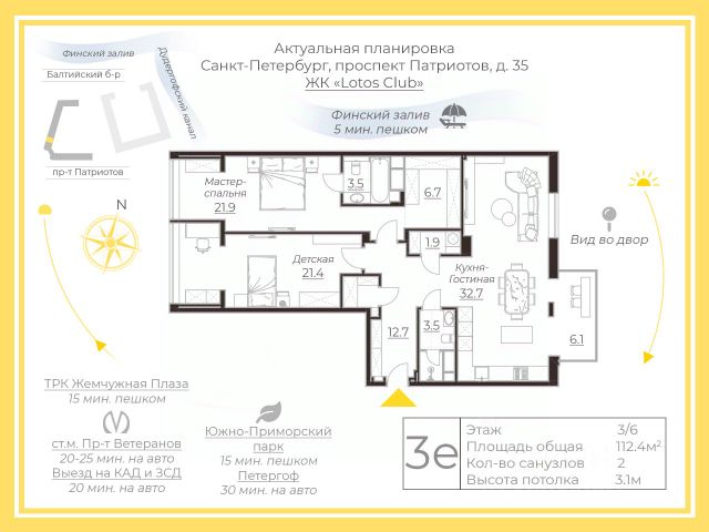 Арт. 125485626 В продаже видовая семейная квартира в жилом комплексе бизнес-класса Lotos Club на берегу Финского залива. В квартире выполнен дорогой качественный ремонт по индивидуальному дизайн-проекту, и она полностью готова к проживанию. Планировка квартиры функциональна и продумана до мелочей: 2 изолированные спальни, одна из которых — мастер-спальня с собственной гардеробной и ванной комнатой и просторная кухня-гостиная с зоной столовой оснащена мебелью и премиальной бытовой техникой Asco и Kuppersbusch. Также предусмотрены постирочная и гардеробная в прихожей. Высота потолков составляет 3,1 метра, что придает пространству ощущение легкости и свободы. В отделке и дизайне использованы материалы ведущих европейских производителей. В комнатах мягкие стеновые панели и кровати Walls Studio. Мягкая мебель в гостиной и столовой Estetica. Ванная, подоконники по всей квартире и столешница на кухне выполнены из натурального камня. Люстры Италия хрусталь. Пол инженерная доска, керамогранит. Межкомнатные двери 2,8 метра. В квартире сделана шумоизоляция, что обеспечивает тишину и уют. Установлены кондиционеры для поддержания комфортной температуры в любое время года. Территория комплекса охраняется круглосуточно, установлены домофоны с видеонаблюдением у подъездов и на лестничных площадках. Имеется подземный паркинг, а двор полностью свободен от машин. В шаговой доступности находятся магазины, детские площадки и объекты социальной инфраструктуры. Для активного отдыха предусмотрены зоны для спорта и три парка, а также благоустроенная набережная с пляжем. Это делает комплекс идеальным местом для семейной жизни, где каждый сможет найти занятие по душе. Эта квартира станет идеальным выбором для тех, кто ценит комфорт, качество и стиль в жизни! Продается квартира на проспекте Патриотов в Санкт-Петербурге.