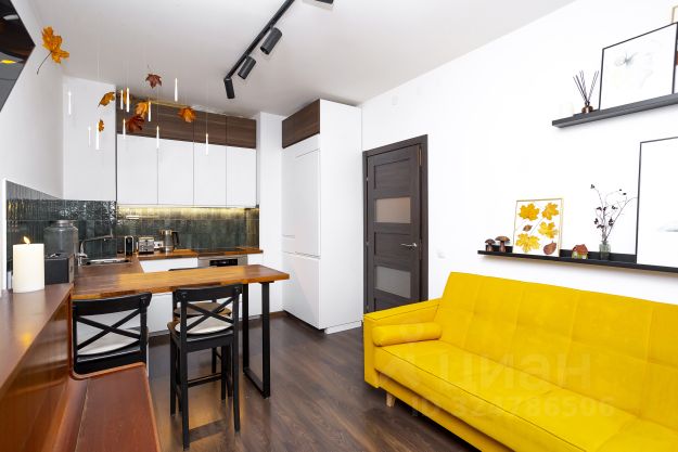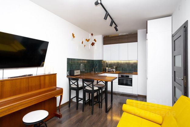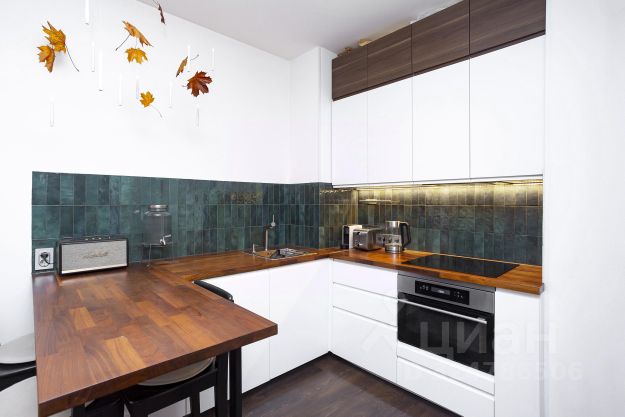 Общая площадь квартиры составляет 41 кв. м, из них жилая — 15 кв. м, а просторная кухня-гостиная — 15 кв. м. укомплектована встроенной кухней отличного качества, где все продумано до мелочей. Каждая секция распланирована для удобного использования. Например, выдвижной ящик для приборов разделен на два уровня, что позволяет разместить большее количество прочих кухонных мелочей. Есть выкатная секция для бутылок, угловая секция укомплектована выкатными корзинами. Встроены большой холодильник Samsung с системой no frost, посудомоечная машина Bosh 60 см, индукционная варочная панель на 4 комфорки, духовой шкаф имеет функцию микроволновой печи. Фартук выполнен из эксклюзивной итальянской плитки. Встроен дополнительный свет, управляемый жестами. Эргономично разграничено пространство кухонной зоны и гостиной.