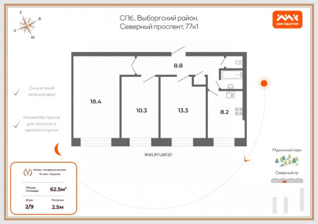 Если Вы очень тщательно и критично подходите к выбору своей будущей квартиры, обращая особое внимание на ВЫСОКОЕ КАЧЕСТВО ДОМА , ЕЕ РАСПОЛОЖЕНИЕ ОТНОСИТЕЛЬНО ЗЕЛЕНЫХ ЗОН И МЕТРО, Вам не все равно какие соседи рядом и вы планируете купить квартиру только при полном отсутствии проблем с документами, то ЭТА квартира для Вас !!! Продается однокомнатная квартира в Выборгском районе недалеко от метро Озерки по адресу: Санкт-Петербург, Северный проспект 18 /1 площадью 37,5 кв.м.+ незастекленная лоджия 2,8 кв.м. ПРАВОВАЯ СТОРОНА: Простая и быстрая сделка. Все документы готовы. Кадастровый номер квартиры: 78:36:0005531:5492 Квартира в собственности более 10 лет. Один взрослый собственник, который будет лично присутствовать на сделке. При покупке материнский капитал не использовался. Без обременений и перепланировок. Подходит под ипотеку и субсидии. Полная сумма в договоре купли-продажи квартиры. Прямая продажа, т.е. если квартира понравилась, то вносится аванс и можно сразу выходить на сделку купли-продажи. О ДОМЕ : Дом кирпичномонолитный построен в 2004 году. 5 парадных. Закрытая территория. В доме видеонаблюдение, в парадных и во дворе очень чисто. О КВАРТИРЕ: Общая площадь 37,5 кв. м.+ незастекленная лоджия 2,8 Высота потолков 2,75 Комната 14,8 Кухня 12,3 Коридор 5,3 Лоджия 2,8 Санузел 5.1 В квартире остается мебель и техника: стиральная машина-автомат, холодильник, посудомоечная машина. ОКРУЖЕНИЕ РЯДОМ: Во дворе- детская и спортивная площадки, супермаркеты, школы, детские сады. Через дорогу находится парк Сосновка. Это огромный лесной массив с небольшими озерами, в которых плавают уточки с утятами, велодорожками. Есть фитнес центр с бассейном. Пишите , звоните !!! Договаривайтесь о просмотре !!! Нравится квартира- покупайте и пользуйтесь !!! Квартира на проспекте Северный в Санкт-Петербурге.