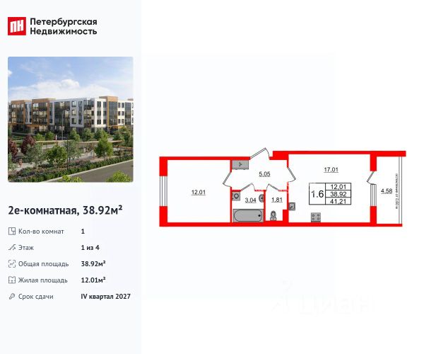 Квартира расположена на 3 этаже 4-этажного монолитно-кирпичного дома 2024 года постройки. Общая площадь — 38,3 м², жилая — 12,1 м², просторная кухня — 17 м², высота потолков — 2,76 м. Есть лоджия, раздельный санузел, окна выходят на улицу и во двор.