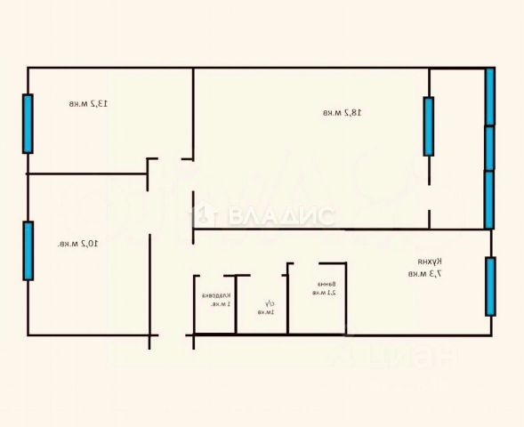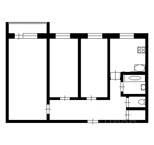 3 изолированные комнаты: 10,8, 13,6, 17,3 м2.