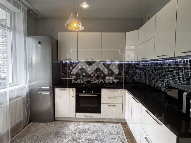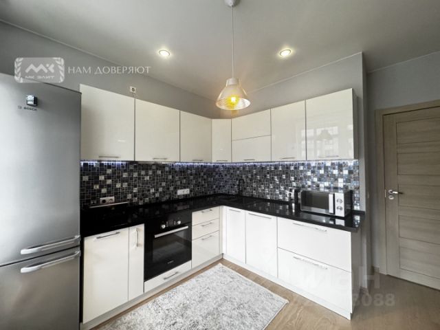 Встроенная кухонная мебель, микроволновка, духовой шкаф, посудомоечная машина Bosch, варочная панель, холодильник, стиральная машина с функцией сушки.