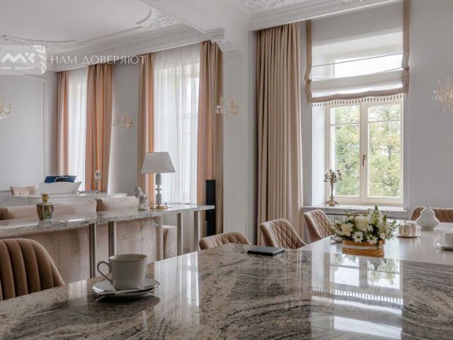 Квартира расположена на 4 этаже с видом как на улицу, так и во двор. Большая кухня гостиная 54,3м2, две спальни 27,4 м2 и 12м2, два санузла, вместительные гардеробные. В 2022 году был проведен полный капитальный ремонт с заменой всех инженерных коммуникаций, стен, перекрытий, окон и электрического ввода до счетчика. Только самые высококачественные и проверенные временем материалы были использованы для отделки. Важно отметить, что на гипсовую лепнину было потрачено порядка миллиона рублей, подчеркивая роскошь и элегантность каждой детали.