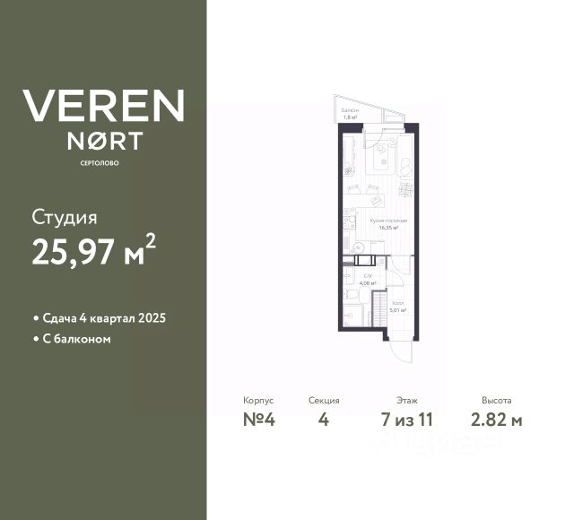 Продается квартира студия в ЖК Новое Сертолово в современном и благоустроенном микрорайоне Сертолово-2.
