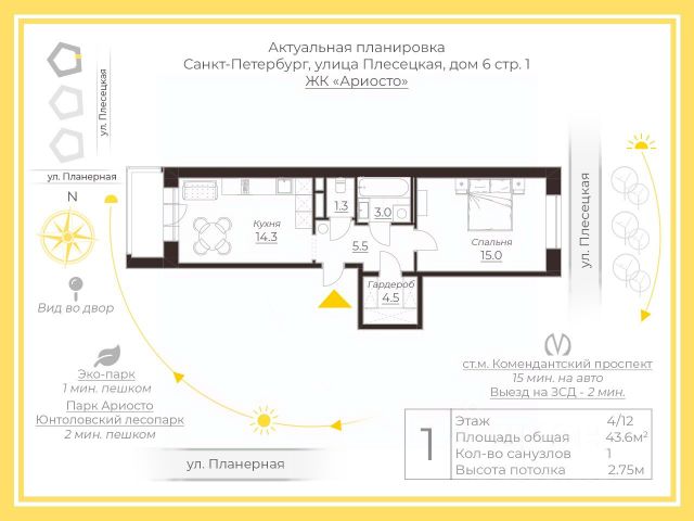 Квартира с прекрасным видовым потенциалом: окна выходят на благоустроенную Площадь Солнца с фонтаном. Зимой здесь появляется новогодняя ёлка, и двор наполняется праздничным настроением. При этом перед домом — простор: нет тесноты и нависающих зданий, вы на высоте и только чистое небо и закаты. Этот вид останется с вами навсегда — новая застройка перед окнами не предвидится.