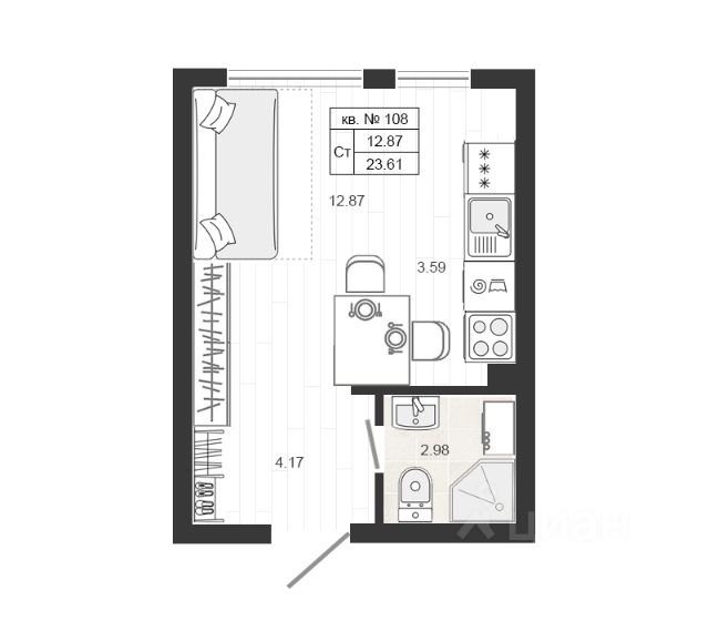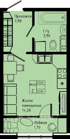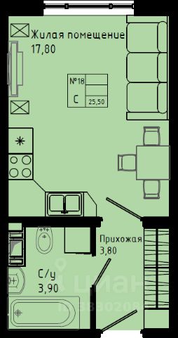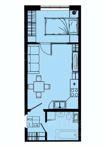 Квартира-студия, общей площадью 26,41 м², жилая площадь 14,25 м², прихожая - 4,81м², санузел - 4,09 м², балкон - 6,51 м².