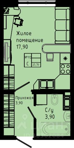 Квартира-студия с натяжными потолками, общей площадью 25,1м², жилая площадь 18,29м², прихожая - 3,80м², санузел - 3,25м²