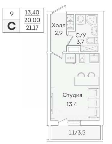 - Комната (20.0м²) ПРАВИЛЬНОЙ формы, что позволяет удобно расставить мебель.