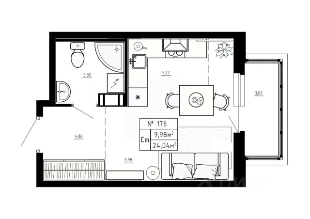 Студия площадью 23.61 в ЖК "А101 Лаголово" на 5 этаже. Квартира без отделки. Вид из окна на улицу. В квартире 1 санузел. Высота потолков 2.84 м.