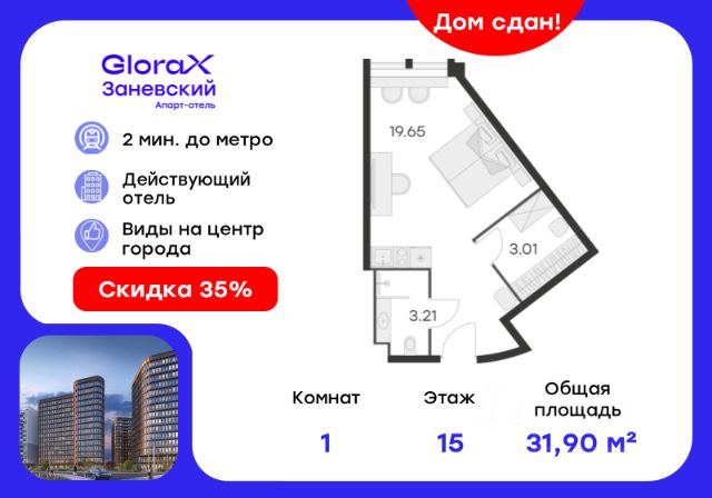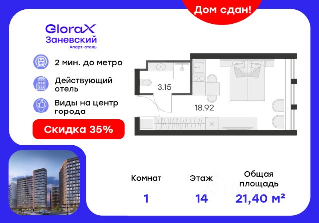 Продается апартамент-студия на 13-м этаже в сданном Апарт-комплексе бизнес-класса "GloraX Заневский". Ключи сразу! Общая площадь лота составляет 22,07 кв. м, из которых 18,92 кв. м отведено под жилую. Номер апартамента - 1 343. Преимущества: - Полная чистовая отделка - Возможность покупки меблировка и техника - Вход по ключ-карте - Прачечная на 1 этаже - Возможность дозаказа отельного сервиса - Программы доходности - Летний бар и променад - Воркаут площадка - Pet-friendly Апартаменты "GloraX Заневский" - проект бизнес-класса с развитой инфраструктурой, удовлетворяющей все потребности самых взыскательных гостей. Располагается в одном из наиболее перспективных, районов Петербурга в 2х минутах от метро "Ладожская" и в 10 минутах от Невского проспекта. В "GloraX Заневский" есть все, что необходимо для комфортной жизни, работы и отдыха. Инфраструктура, покрывающая все потребности и ожидания собственников и арендаторов. В радиусе 150 метров находятся супермаркеты с возможностью доставки продуктов прямо до дверей апартаментов. На 1000 кв. м. общественных пространств расположится уютный лобби-бар, ресторан мировой кухни на 80 человек и оборудованные коворкинги. В апартаментах "GloraX Заневский" выполнена современная отделка с использованием высококачественных экологичных материалов. В проекте предусмотрен подземный отапливаемый паркинг на 100 мест, куда можно спуститься на лифте прямо от дверей апартаментов. Цена указана при 100% оплате или стандартной ипотеке. Узнайте подробности в Отделе продаж.