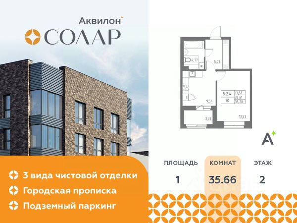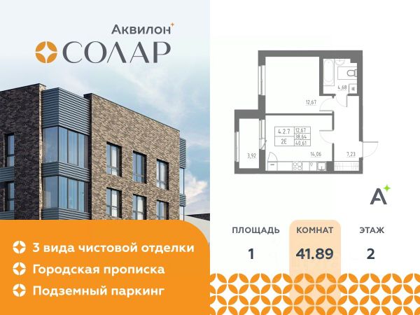 Продается 1-комн. квартира с предчистовой отделкой в ЖК "Аквилон SOLAR" на 2 этаже. Общая площадь: 41.89 кв.м., жилая: 12.67 кв.м., площадь просторной кухни-столовой: 14.18 кв.м. Все окна выходят на одну сторону. В квартире один балкон, один совмещенный санузел. Высота потолков 2.7 м.
