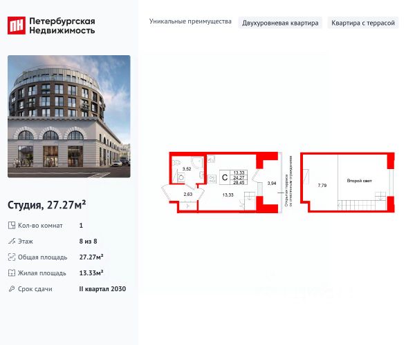 Продается просторная студия от застройщика в жилом комплексе "Аристократ" в уютном Василеостровском районе. До метро можно добраться пешком всего за 10 минут. Открытая терраса! Завтракайте или занимайтесь спортом на свежем воздухе! В такой квартире вы можете самостоятельно создать второй антресольный уровень или использовать высокие потолки, как эксклюзивное дизайнерское решение. Уникальная, функциональная европланировка, вместительная прихожая 2.63 м². Общая площадь студии - 27.27 м², жилая 13.33 м². Квартира продается c черновой отделкой. Что особенного в ЖК "Аристократ"? • Премиальная отделка квартир - Норд Лайн бизнес • Васильевский остров - историческая локация с современными культурными кластерами • Индивидуальный облик каждого корпуса в единой архитектурной концепции • 7 парадных лобби с потолками до 7-ми метров • Цветущие сады, зеленые гостиные, фонтаны • Клуб резидентов "Аристократ": фитнес-клуб, коворкинг, гостиная с роялем, детский центр с кинотеатром • Технологичная среда на территории, в доме и в квартире
