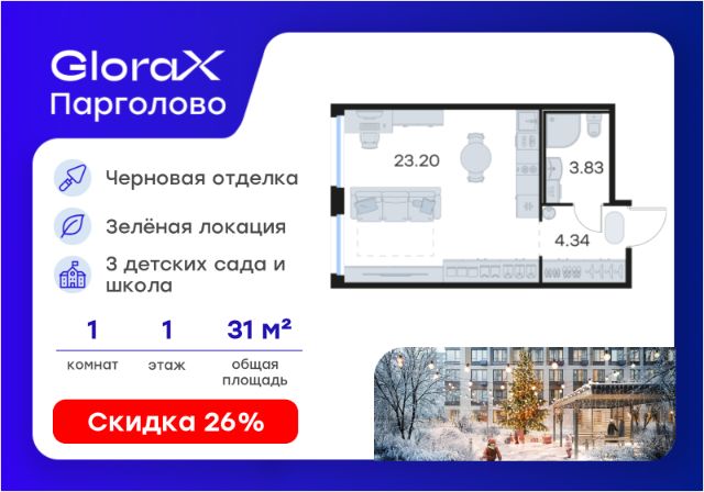Продается квартира-студия на 4-м этаже в проекте комфорт-класса GloraX Парголово. Общая площадь лота составляет 29,75 кв. м, из которых 20,26 кв. м отведено под жилую и кв. м под кухонную зону. Номер квартиры - 167. Преимущества: - Квартира комфорт-класса - Зеленый район, Шуваловский парк в 20 мин. пешком - 10 мин. до КАД, 15 мин. до ЗСД - 5 эт. паркинг на 451 м/м - Закрытые дворы с видеонаблюдением - Детские площадки с геопласткой и бизиборадми - Сады и школы в шаговой доступности - Спортивные площадки и велодорожки - Собственный комьюнити-центр - Келлеры для хранения - Коммерческие помещения на 1 этажах GloraX Парголово — масштабный проект комфорт-класса в Выборгском районе Санкт-Петербурга. Место, продуманное до мелочей, где все, что необходимо — рядом. Архитектурно-пространственное решение отличается лаконичностью и строгостью и придает проекту свой характер. Внутренние дворы закрыты от внешнего мира, создавая приватную территорию для жителей. Живите на природе, но с комфортом мегаполиса. Десять минут на велосипеде или полчаса пешком — и вы окажетесь в одном из культовых мест отдыха петербуржцев: Шуваловском парке, Орловском заказнике с их чистыми карьерами или на Суздальских озерах. До ж/д станции "Парголово" 7 минут на автомобиле, до метро Проспект Просвещения 25 минут, КАД 10 минут, ЗСД 15 минут. В шаговой доступности остановка общественного транспорта. В шаговой доступности — собственные школы и детские сады. Здесь все создано для максимального комфорта каждого жителя. Приватное пространство внутреннего двора с беседками с розетками для работы и отдыха, зеленый двор с уютным многоуровневым освещением, детскими эко-площадками и спортивными workout создает неповторимую атмосферу, заряжающую энергией на новые свершения. Квартиры сдаются без отделки. Цена указана при 100% оплате или стандартной ипотеке. Узнайте подробности в Отделе продаж.