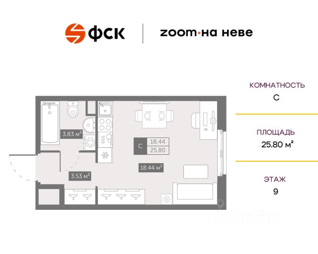 Цена со скидкой до 30% в прямой продаже от застройщика — только в этом месяце. На апартаменты действует беспроцентная рассрочка. Роскошные виды на Неву. Апартамент-студия в комплексе класса бизнес-лайт Зум на Неве на 13-м этаже. Общая площадь 18,52. Без отделки. Зум на Неве расположен в новом месте силы рядом с центром города на первой линии Октябрьской набережной в Невском районе, всего в 7 км от исторической части Санкт-Петербурга. Большой выбор эргономичных и максимально продуманных планировок позволит каждому найти вариант по душе. Панорамные виды на Неву, благоустроенные дворы, детская игровая комната, подземный паркинг, коммерческие зоны на первом этаже, это и многое другое делает Зум на Неве идеальным местом для жизни. Особенности: - Панорамные виды на Неву и город; - 10 мин. до Парка Строителей, 15 мин. до Лондон-молла, Ленты, Максидома, 15 мин. до метро "ул. Дыбенко", 12 мин. до КАД, 10 мин. до центра; - Единая архитектурная концепция. Сдержанные и монументальные фасады в неоклассическом стиле; - Парадный лобби для жильцов. Единый вход в комплекс с администратором, зоной ресепшн и охраной, зоной для бесконтактной доставки посылок и еды; - Подземный отапливаемый паркинг с доступом из парадной; - Доступно 3 варианта отделки на выбор: черновая, предчистовая (White Box) и чистовая; - Зоны отдыха для взрослых и детей, Wi-Fi-покрытие во дворе и в паркинге, зоны для питомцев, арт-объекты и много другое. В шаговой доступности вся необходимая инфраструктура от детских садов и школ до супермаркетов и салонов красоты; - Все происходящее контролируется видеокамерами, а покой внутренней территории и безопасность ваших детей гарантируется полным отсутствием транспорта во дворах в концепции "без машин". Продам квартиру-студию в дешевой новостройке в Санкт-Петербурге.