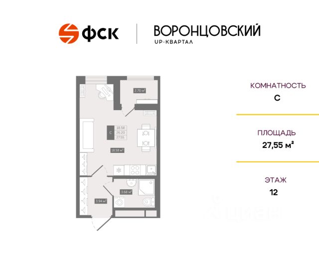 Продается квартира студия в жилом комплексе "Высота. Новодевяткино" от ГК СТОУН нa 7 этаже. Общaя площадь cоcтaвляeт 28.55 кв. м.