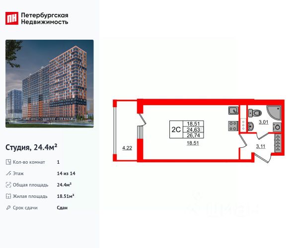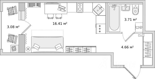 Комната 18.92 кв. м. , прихожая 3.04 кв. м. , санузел 3 кв. м.,