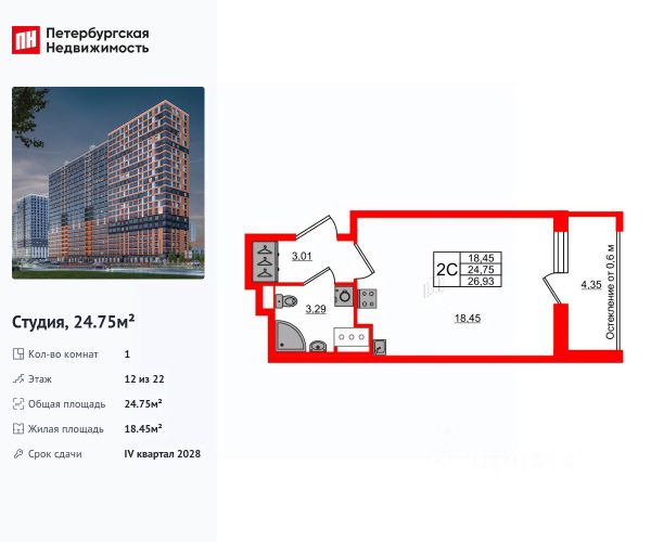 Общая площадь квартиры - 24.96 кв. м. , высота потолка 2,77 м.
