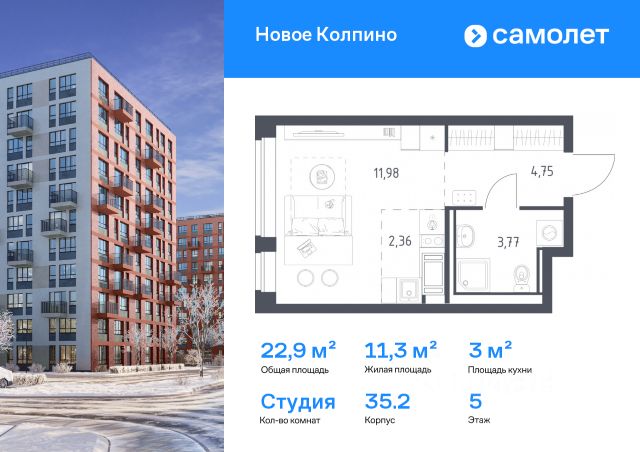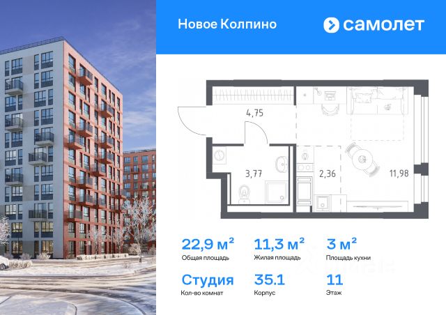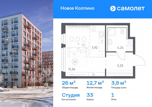 Строим кварталы для жизни с заботой о будущем. Предлагается квартира студия комфорт-класса 21,83 кв.м в корпусе 33 на 4 этаже, в ЖК "Новое Колпино" Квартира без отделки. Доступность опции "отделка" и возможность комплектации мебелью и декором уточняйте у застройщика. Приобрести квартиру возможно по специальным акциям от застройщика, с текущими условиями акций можно ознакомиться в блоке "Акций". Цена динамическая и может отличаться, уточняйте актуальность у застройщика. Квартал "Новое Колпино" — современный квартал в тихом и зеленом районе Санкт-Петербурга. Здесь можно подолгу любоваться пышными кронами деревьев, подставляя лицо теплым лучам солнца. А еще в любой момент можно сесть в машину и уже через час оказаться в сердце Северной столицы. Будет легко планировать поездки: до центра Петербурга, или площади Восстания, — 25 минут на поезде. С территории квартала удобно выезжать на крупные магистрали: путь до Южного шоссе займет 15 минут на авто, а до Петрозаводского шоссе — всего 6 минут. В 20 минутах на авто находится метро "Рыбацкое", а в 7 минутах — ж/д станция Колпино. Проводите выходные на природе в Колпинском парке, который находится недалеко от квартала, на берегу реки Ижоры. Летом здесь можно вместе с детьми веселиться на аттракционах, кататься на лодке, играть в бадминтон или волейбол. А еще можно захватить орехов и покормить белок. Всего 7 минут на авто или автобусе — и вы в центре города Колпино. Взрослых впечатлит русская архитектура старинных церквей, а детям понравится забавный памятник героям мультфильма "Трое из Простоквашино". В "Новом Колпино" будут работать 4 детских сада, 3 из них уже готовы встречать малышей. Ребята постарше могут ходить на занятия в школу с собственным бассейном, в проекте уже работает новая современная школа с бассейном Корпуса высотой 11 этажей с французскими и панорамными балконами отделаны штукатуркой и облицовочным кирпичом. Вдохновение для палитры нам подарили оттенки рассветного неба: терракотовый, персиковый, песочный. Во дворе найдется интересное занятие для всех жителей квартала. Взрослые смогут устраивать тренировки на свежем воздухе в спортивных зонах, дети будут целый день веселиться на игровых площадках. А еще мы позаботились о вашей безопасности и закрыли дворы от машин. Возвращайтесь домой с чемоданом из путешествия или коляской из парка. На пути в подъезд вы не встретите ступенек. Оставить транспорт можно будет в специальном помещении на первом этаже. По желанию вы сможете получить ключи от квартиры с готовой отделкой. Мы положим ламинат, поклеим обои, установим мебель и сантехнику. Доступен вариант с готовой кухней — бежевые тона отделки станут фоном для интерьера мечты. Чтобы сразу отпраздновать новоселье, закажите у нас декор и мебельные сеты. А если хочется воплотить собственные идеи в интерьере, присмотритесь к опции — без отделки. Продается квартира-студия в дешевой новостройке в Колпино.