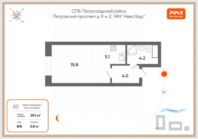 Цена действует при 100% оплате и на определенные ипотечные программы. Подробности — в отделе продаж по телефону. ЖК Нева Хаус - это масштабный проект элитного класса, который возведен застройщиком "ЛСР. Недвижимость - Северо-Запад" в одном из самых зеленых уголков Петроградского района. Он состоит из восьми монолитных разновысотных корпусов, в архитектурном облике которых гармонично сочетаются элементы постмодернизма, классического стиля и современных тенденций. Дизайн-проект ЖК был разработан известным петербуржским архитектором Евгением Герасимовым. Наружные стены домов оснащены износостойкими навесными фасадами и облицованы декоративным клинкерным кирпичом нескольких оттенков. Высота домов в проекте варьируется от 7 до 9 этажей. Комплекс оснащен современным оборудованием, которое обеспечивает жильцам максимальный уровень безопасности и комфорта. Покупателям предлагается разнообразный выбор планировок элитного жилья, начиная от просторных однокомнатных квартир и заканчивая пятикомнатными видовыми пентхаусами. Высота потолков в помещениях составляет 3-3.8 метра. Во всех форматах жилья предусмотрены большие кухни (от 12 кв. м), зонированные прихожие с отдельными гардеробными, увеличенные оконные проемы, ниши для установки кондиционеров и изолированные от бытовых помещений спальни. Разнообразие планировок включает варианты с просторными террасами, объединенными кухнями-гостиными, раздельными санузлами и дополнительными туалетами, эркерами и помещениями нестандартной формы. Площадь квартир - 46.87-300.79 квадратных метров. Базовая стоимость жилья не включает предчистовую или чистовую отделку помещений. В готовых квартирах установлены усиленные дизайнерские двери, оконные блоки с дерево-алюминиевыми рамами из натурального дуба и двойными стеклопакетами, современные отопительные радиаторы, оснащенные регуляторами температуры, и счетчики с функцией автоматического сбора и передачи данных. Закрытые дворы комплекса превращены в уютные прогулочные зоны для детей и взрослых. Застройщик выполнил озеленение пространства, согласно авторскому проекту ландшафтного дизайна, проложил велодорожки и тротуары, организовал закрытую набережную, установил многофункциональные спортивно-игровые городки, беседки, лавочки и стойки для велосипедов. Вся территория ЖК круглосуточно находится под охраной и видеонаблюдением. Для автотранспорта жильцов новостройки предусмотрены подземные паркинги с возможностью доступа из всех парадных на лифте. Их общая вместимость составляет 907 машиномест. Для посетителей организованы наземные стоянки по внешнему периметру территории. Жилой комплекс Нева Хаус находится в элитном районе города в окружении разнообразных объектов инфраструктуры. В пешей доступности работают гимназии, бутики, рестораны, спортивный стадион "Петровский" и филиалы ВУЗов, есть парк и яхт-клуб. Купить квартиру в жилом комплексе Нева Хаус можно в рассрочку или с привлечением ипотечного кредита, в том числе, и на льготных условиях с использованием воен Квартира-студия элитные на проспекте Петровский в Санкт-Петербурге.