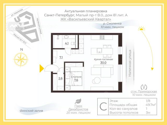 Арт. 129572365 Стильная студия в ЖК бизнес-класса "Васильевский Квартал" на Васильевском острове. Объединенное пространство кухни-гостиной с выделенной спальной зоной, совмещенная ванная комната с душевой кабиной, гардеробная и просторная прихожая с дополнительными зонами для хранения. Трехметровые потолки, большие окна. Окна квартиры выходят на Наличную улицу. Дизайн-проект выполнен в стиле Арт-деко. В оформлении использованы декоративная штукатурка, керамогранит крупный формат 2800/120 FMG Италия, натуральное дерево (паркет, стеновая панель и дверь шпон дуба). Премиальная бытовая техника Miele, Asko, Faber, Omaikiri. Квартира оборудована системой темных полов, имеется воздушный бризер и измельчитель. Жилой комплекс "Васильевский Квартал" расположен в историческом центре Санкт-Петербурга, в окружении всей необходимой инфраструктуры. ЖК построен в традиционной архитектуре Петербурга. Малоэтажные кирпичные дома. Просторные лобби с отделкой натуральным мрамором. Подземная парковка. Закрытая и охраняемая территория с круглосуточным видеонаблюдением. Удобная транспортная доступность до любой точки города. Прямая продажа. Купить квартиру-студию элитные на проспекте Малый Васильевского острова в Санкт-Петербурге.