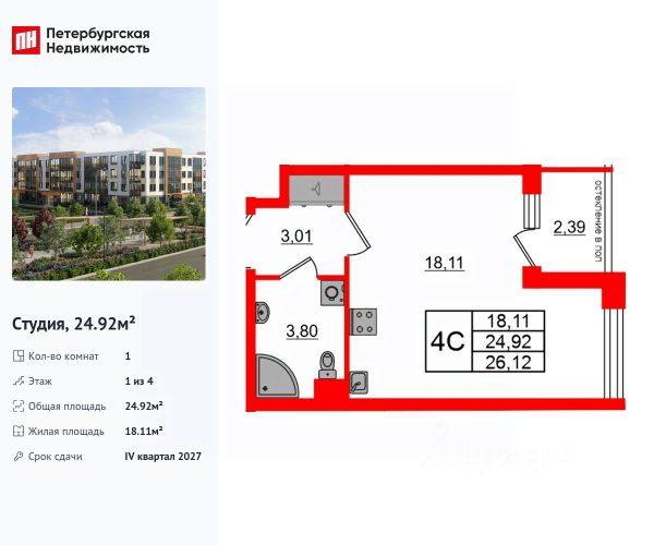 Цена действует при 100% оплате и на определенные ипотечные программы. Подробности — в отделе продаж по телефону. Продается студия в ЖК "Пулково Лейк" на 1 этаже. Общая площадь составляет 23.70 кв. м. Квартира с чистовой отделкой. Жилой комплекс "Пулково Лейк" располагается по адресу Санкт-Петербург, Московский. Пулково Лейк - проект малоэтажной застройки на берегу озера на границе Московского и Пушкинского районов. Дома высотой всего 4 этажа, квартиры от уютных студий до трехкомнатных квартир для большой семьи. Широчайший выбор планировок, включая квартиры с мастер-спальнями, патио, каминами, саунами, двухуровневые квартиры. Школа, детские сады, парк на берегу озера и выезды на Пулковское и Петербургское шоссе. Расположение: • 5 мин на авто до Аэропорта Пулково; • 10 мин на авто до станций метро "Московская; • 10-15 мин на авто до городов Пушкина, Павловска и Гатчины; • 20 мин на авто до центра Санкт-Петербурга. Квартиры в проекте сдаются с предчистовой и чистовой отделкой Соmfоrt Stоnе и Соmfоrt Wооd по современным стандартам - Вы можете сами выбрать отделку, подходящую именно Вам. Дома оборудованы самыми современными инженерными системами и "Умным домом". В рамках проекта будет построена современная школа на 925 мест и 2 детских сада на 160 и 240 мест, выезды на Пулковское и Петербургское шоссе, а также храм рядом со сквером "Пулковский рубеж". Общественное пространство вдоль берега озера превратится во всесезонный парк, в котором найдется место для любых активностей от пробежек, катания на САПах и велосипедах до отдыха в шезлонгах и любования закатом солнца. Зимой будет работать каток, проложен лыжный маршрут, предусмотрено место для новогодней елки и горок для детей. Для Ваших питомцев - площадка для выгула собак. Преимущества: • Высота потолков от 2,6 до 4,5 м; • Уникальные планировки; • Парк на берегу озера; • Система "Умный дом"; • Дворы без машин; • Колясочная в парадной; • Видеонаблюдение в холлах, на первом этаже, в лифтах и в паркингах. Успейте приобрести квартиру на выгодных условиях! Чтобы узнать подробности, обращайтесь за консультацией по телефону.