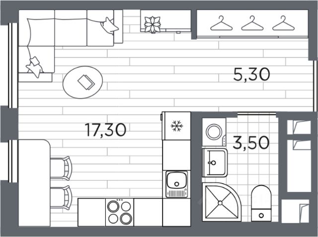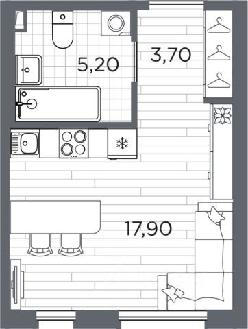 Планировка коридора-прихожей (4,3 квадратных метра) и высота потолков 2,75 метра позволяет установить вместительный шкаф для вещей.