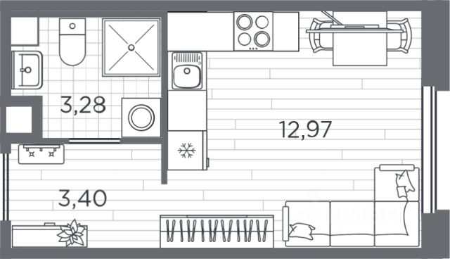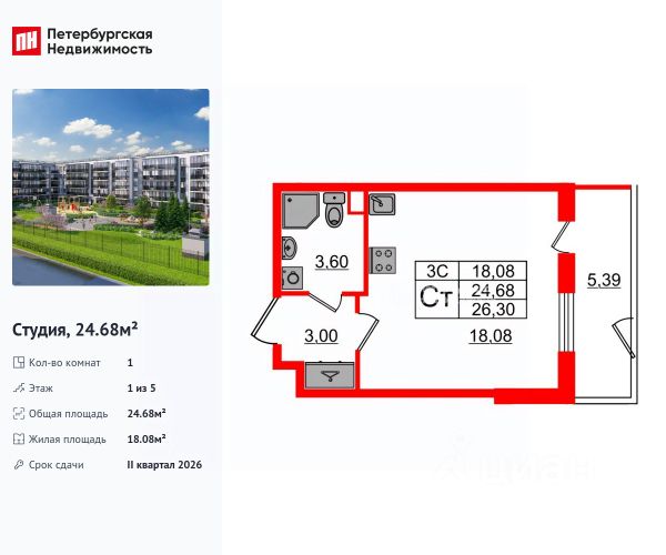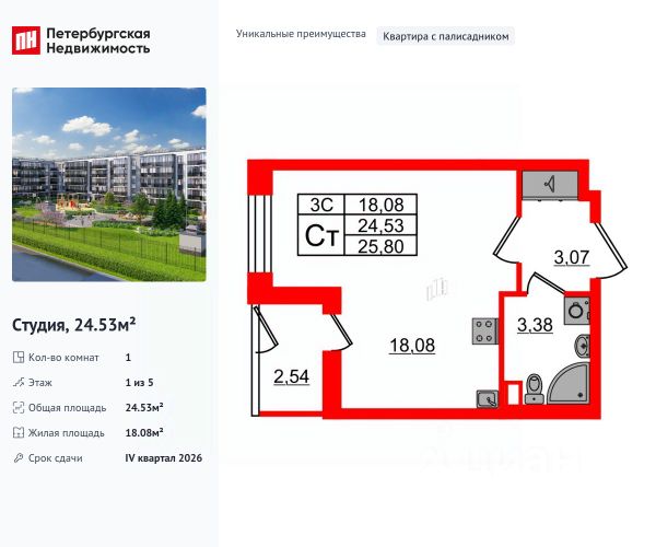Продается большая, светлая, теплая студия, с квадратной комнатой и застекленной лоджией (5,7 квадратных метра плюс к общему метражу), с добавочным выходом в зеленый двор. Окна выходят на юго-восток; солнышко, если светит, то в первой половине дня. Студия расположена в современном пятиэтажном доме в ЖК "Зеленый Квартал" на Пулковских высотах. Дом построен и сдан в 2023 году группой компаний Сетл-Сити. В квартире отделка от застройщика в светлых тонах.