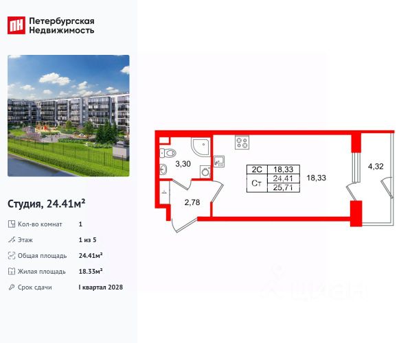 Продается большая, светлая, теплая студия, с квадратной комнатой и застекленной лоджией (5,7 квадратных метра плюс к общему метражу), с добавочным выходом в зеленый двор. Окна выходят на юго-восток; солнышко, если светит, то в первой половине дня. Студия расположена в современном пятиэтажном доме в ЖК "Зеленый Квартал" на Пулковских высотах. Дом построен и сдан в 2023 году группой компаний Сетл-Сити. В квартире отделка от застройщика в светлых тонах.
