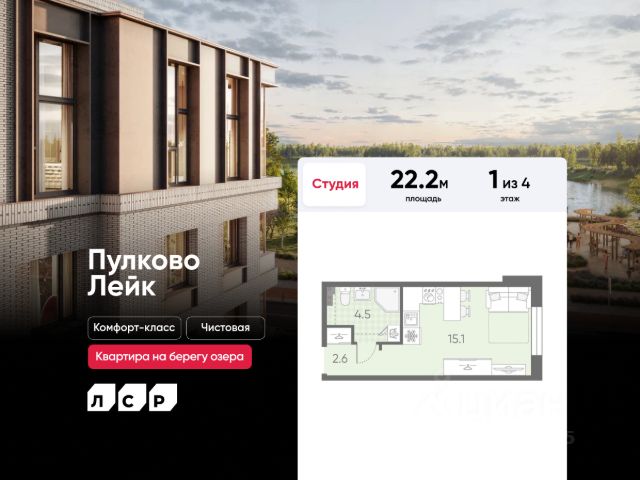Продается студия в ЖК "Пулково Лейк" на 1 этаже. Общая площадь составляет 22.10 кв. м. Квартира с чистовой отделкой. Жилой комплекс "Пулково Лейк" располагается по адресу Санкт-Петербург, Московский. Пулково Лейк - проект малоэтажной застройки на берегу озера на границе Московского и Пушкинского районов. Дома высотой всего 4 этажа, квартиры от уютных студий до трехкомнатных квартир для большой семьи. Широчайший выбор планировок, включая квартиры с мастер-спальнями, патио, каминами, саунами, двухуровневые квартиры. Школа, детские сады, парк на берегу озера и выезды на Пулковское и Петербургское шоссе. Расположение: • 5 мин на авто до Аэропорта Пулково; • 10 мин на авто до станций метро "Московская; • 10-15 мин на авто до городов Пушкина, Павловска и Гатчины; • 20 мин на авто до центра Санкт-Петербурга. Квартиры в проекте сдаются с предчистовой и чистовой отделкой Соmfоrt Stоnе и Соmfоrt Wооd по современным стандартам - Вы можете сами выбрать отделку, подходящую именно Вам. Дома оборудованы самыми современными инженерными системами и "Умным домом". В рамках проекта будет построена современная школа на 925 мест и 2 детских сада на 160 и 240 мест, выезды на Пулковское и Петербургское шоссе, а также храм рядом со сквером "Пулковский рубеж". Общественное пространство вдоль берега озера превратится во всесезонный парк, в котором найдется место для любых активностей от пробежек, катания на САПах и велосипедах до отдыха в шезлонгах и любования закатом солнца. Зимой будет работать каток, проложен лыжный маршрут, предусмотрено место для новогодней елки и горок для детей. Для Ваших питомцев - площадка для выгула собак. Преимущества: • Высота потолков от 2,6 до 4,5 м; • Уникальные планировки; • Парк на берегу озера; • Система "Умный дом"; • Дворы без машин; • Колясочная в парадной; • Видеонаблюдение в холлах, на первом этаже, в лифтах и в паркингах. Успейте приобрести квартиру на выгодных условиях! Чтобы узнать подробности, обращайтесь за консультацией по телефону.